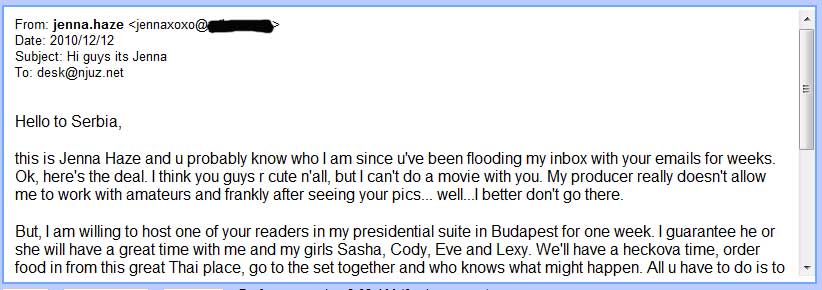 – Pratim Njuz.net skoro od samog početka – izjavila je Džena našem novinaru. – Moj producent je Amerikanac srpskog porekla. Pošto je stalno čitao vaš portal i kidao se od smeha, i mene je zainteresovao za tekstove. Stalno mi prevodi vaše članke na engleski i jako su mi duhoviti. Neke stvari ne razumem jer nikada nisam živela u Srbiji, ali generalno kapiram fazone i jako ste mi simpatični. Bolji ste od našeg “Oniona”. Oni nikada nisu organizovali paradu oralnog seksa. Mislim da su Srbi nacija sa najboljim smislom za humor, a pošto ja to kod muškarca najviše cenim, odlučila sam da jednog vašeg čitaoca nagradim ovom ponudom – zaključila je Džena.